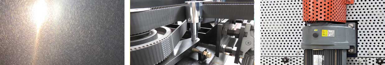 和紋表面,其砂紋遠看似連圈砂紋,近看實則不規格的亂紋,亦俗稱“圈圈紋”,由磨頭各向不規則擺動磨成。吉力佳通過成熟的技術支持,于2014年新開發的高密度覆蓋和紋JLHW系列具有操作簡易、耗能少、生產效率高的特點。已獲得專利技術的磨頭衛星式環形運動軌跡搭配特殊的磨料工藝,可以覆蓋表面上任何方向的微小空白。